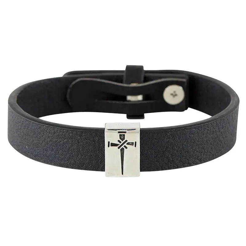 This leather bracelet features a black leather band and a silver charm. The cross of nails on the charm is a strong and bold reminder of our faith. At an 8", adjustable size, this is a perfect gift for any man or woman on your list!